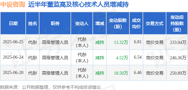 中设咨询近半年内的董监高及核心技术人员增减持详情如下: